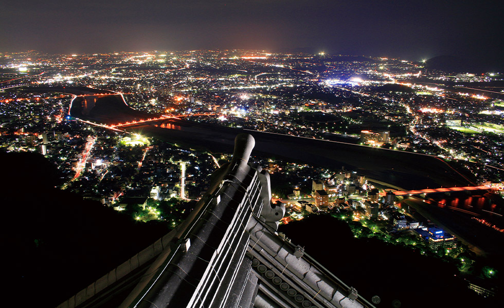 岐阜市のシンボル、標高329m(国土地理院の三角点の標高)の金華山にそびえる山城。かつては戦国時代の英傑、斎藤道三や織田信長の居城であった。山頂城郭と山麓の居館、登城路や山中の砦など、山全体が天然の要害としての機能を備える。1956年に鉄筋コンクリート造の3層4階構造の天守として再建。現在は麓の岐阜公園から山頂まで「ぎふ金華山ロープウェー」で結ばれ、アクセスも良好だ。「岐阜城パノラマ夜景」と冠したイベントでは、岐阜城とロープウェーが共に夜間延長営業を実施。年間を通じて実施している城郭ライトアップもイベント時は減灯することで、天守閣からの夜景鑑賞を邪魔しない取り組みを行っている。「日本三大夜城」に認定された最大の魅力は、天守閣から望む雄大な濃尾平野の大パノラマ夜景だ。眼下の岐阜市街から遠方の名古屋市街の高層ビル群さらには、伊勢湾まで散りばめられた光模様は宝石箱に例えられるほど。煌めきに加え、ダイナミックな奥行きを感じさせる構図も特徴的だ。贅沢な夜景を眺めるだけで、まるで自分自身が一国一城の主になったような気持ちで夜の世界に浸れるだろう。また初夏から秋にかけて、ぎふ長良川鵜飼の篝火が水面に揺らめき、幻想的かつ趣ある風情を漂わせる。「日本百名月」にも認定され、中秋の名月には岐阜城と月を重ねて撮影する夜城も新たな観光コンテンツとして注目されている。