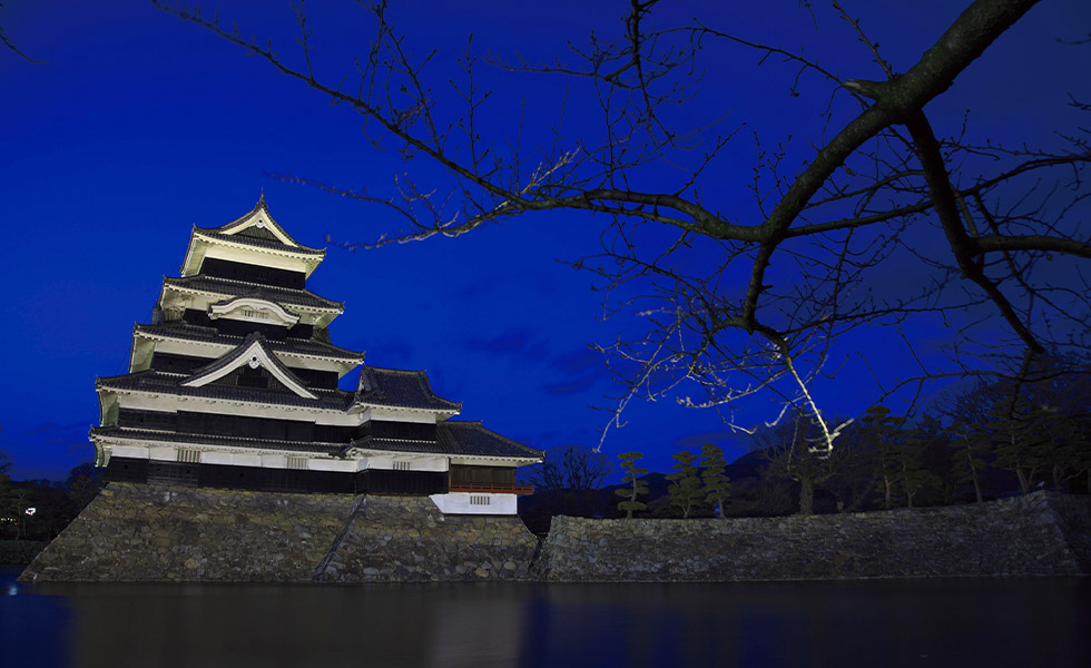松本城は、かつては「深志城」と呼ばれ、戦国時代初期の永世年間に信濃守護小笠原氏の本城である林城の支城の一つとして築城されたといわれている。天守5棟は、戦国時代末期から江戸時代初期にかけて建造され、現存する五重六階の天守としては日本最古である。天守が建つ本丸は内側から「内堀」「外堀」「総堀」と呼ばれる三重の水堀に囲まれ、本丸北側では内堀が外堀と接続し、一体化している。戦国末期に鉄砲戦を想定して造られた天守は、弾丸を通さぬ厚い壁をもち、狭間を115も備え、堀の幅は鉄砲の有効射程と同様の60m前後となっており、戦いに備えた造りである。各階とも外壁上部は大壁づくり城漆喰仕上げ、下部は下見板張りに黒漆を塗っている。その姿は、白と黒のコントラストが美しい。明治の大修理後の昭和11年に旧国宝に指定され、昭和27年文化財保護法により4つの国宝城郭のひとつに指定された。松本城は幾度の存続の危機を市民の情熱により乗り越え、戦国時代そのままの天守が現在まで保存されている。長きに渡り、松本城の解説・案内を行うボランティアガイドや、天守の床を磨くボランティア、地元の小中学生による清掃など、多くの市民の力に支えられているのだ。夜間のライトアップは、白と黒の城のコントラストをより鮮明に際立たせ、闇の中に荘厳な姿が浮かび上がる。「日本三大夜城」に認定されたひとつの要因としては、単なる城のライトアップとしての魅力だけではない。春の時期に催される、天守と本丸庭園の桜のライトアップイベント「夜桜会」、冬の恒例となったプロジェクションマッピングや氷彫フェスティバル、天守ナイトツアーなど夜景観光における様々な取り組みを積極的に実施している点も評価された。